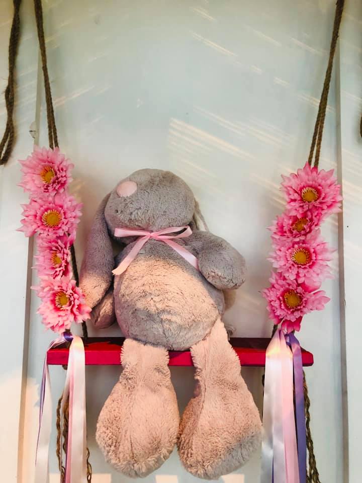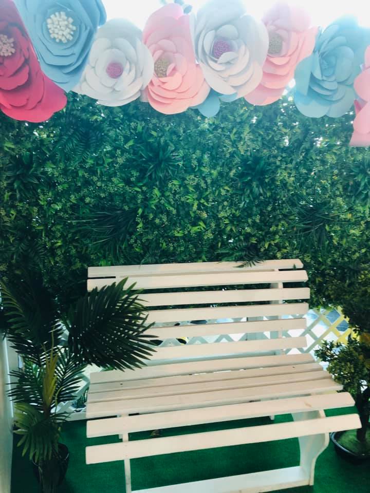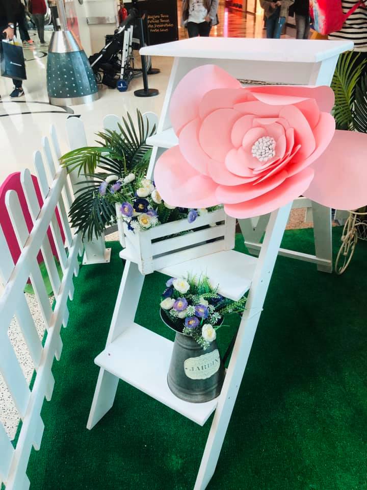 A decoração que está na imagem é feita com cortinados e com acabamentos em flores coloridas. A loiça utilizada é de estilo minimalista e com toque de romantismo.